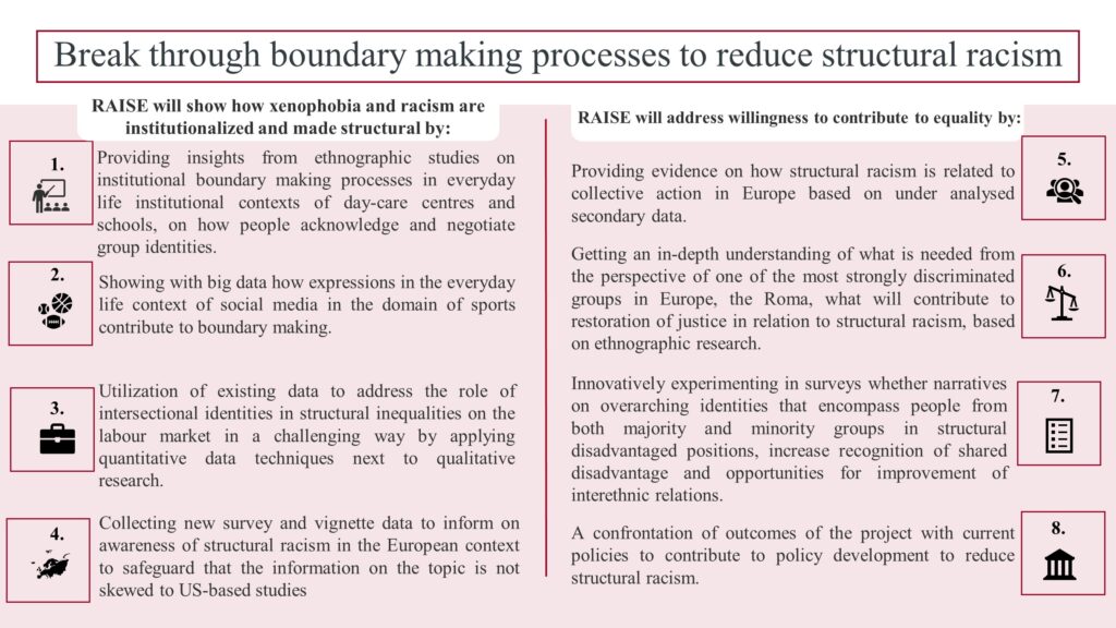 RAISE draws on the assumption that to reduce structural racism, people (and the institutions they operate in) have to be aware of these underlying boundary making processes that reproduce structural racism and the role it has in lasting inequalities. Recognition and acknowledgment of these forms of injustice will contribute to social action for equality. The project will be the first in Europe to empirically study the awareness of boundary making processes in reproducing structural racism and what collective actions contribute to breaking through such boundary making processes.